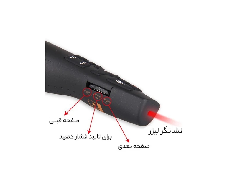 نقطه لیزری قرمز رنگ آن، با وضوح و بُرد بالا، به شما کمک میکند تا توجه مخاطبان را به نقاط کلیدی و مهم محتوای خود جلب کنید. دکمههای کنترلی بزرگ و خوشدست این دستگاه، امکان جابجایی سریع و آسان بین اسلایدها (عقب و جلو) و همچنین حالت تمام صفحه را فراهم میآورد.